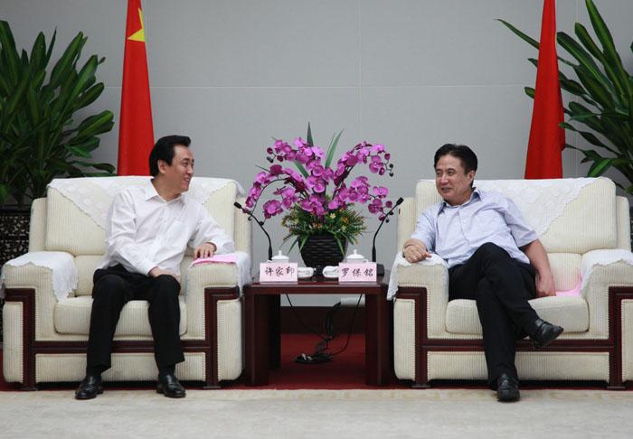 海南省委书记罗保铭(右)与许家印主席亲切交谈
